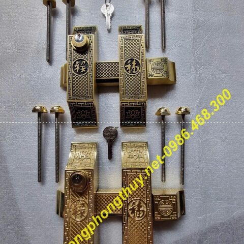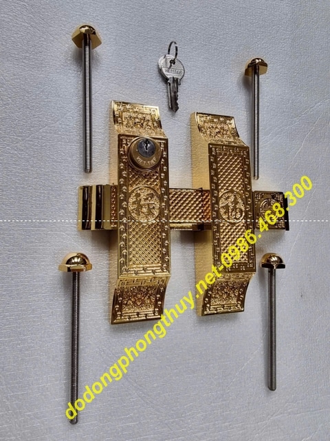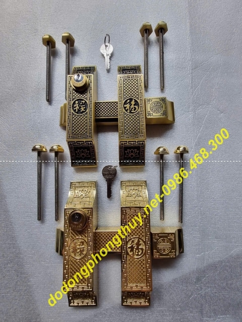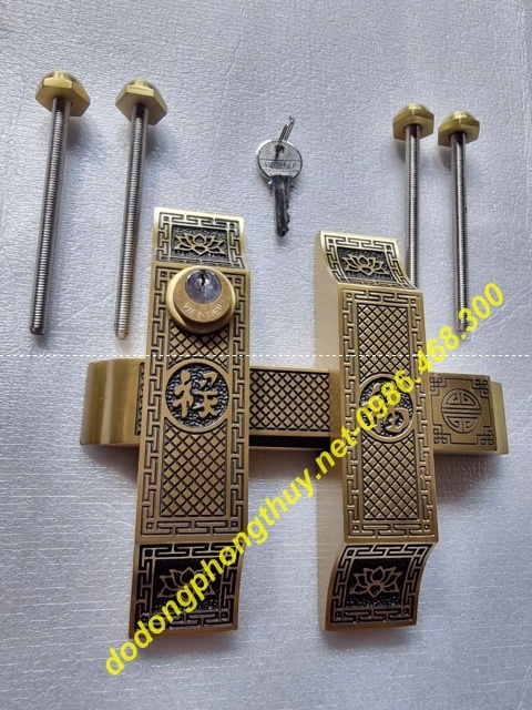 Bộ khóa cửa gỗ bằng đồng nguyên khối được chế tác dựa theo nguyên mẫu then cửa cổng, cửa bức bàn bằng gỗ. Nó gồm 2 cái tay nắm hình hộp chữ nhật, bề mặt được tạo tác hoa văn độc đáo, kết hợp với chữ Phúc, Lộc với mong ước đón tài lộc ngày từ lớp cửa đầu tiên. Mỗi khi cánh cửa mở ra là đón ngay phúc, lộc, may mắn vào nhà.
